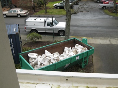 A dumpster of toilets to be recycled into PoticreteRecycling has reached a new level for the transportation construction industry.