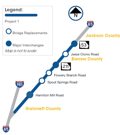 I-85 widening Phase 2 map by the Georgia DOTThe contract involves designing and building one additional lane in each direction on Interstate 85 northeast of Atlanta, giving it a total of six lanes, according to the Georgia DOT. The project between S.R. 53 and U.S. 129 in Jackson County will replace an overpass bridge and six mainline bridges along the interstate. Design work is scheduled to be completed by the end of the year, with construction starting next year, the GDOT says.